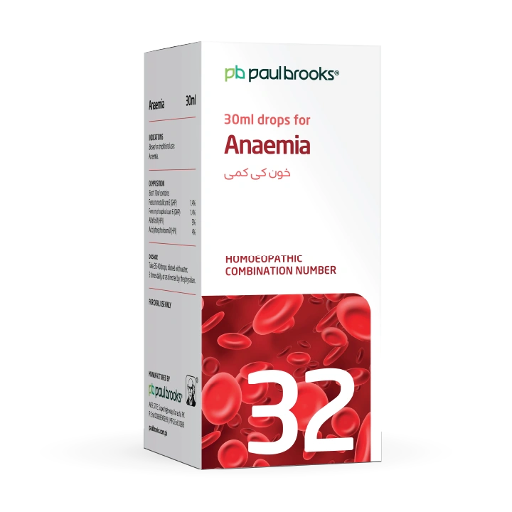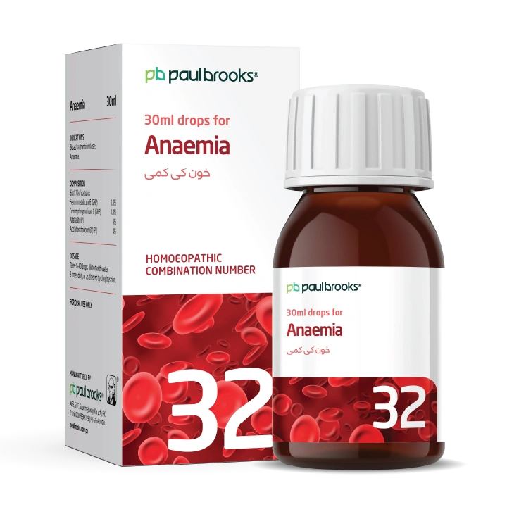 Paul Brooks Combination No. 32 (30 ml) is a useful remedy for anemic conditions. Enriched with natural ingredients like Ferrum metallicum, Alfalfa, and Acid phosphoricum, it helps manage symptoms associated with anaemia naturally.