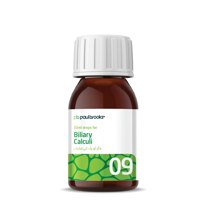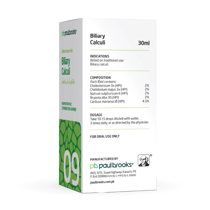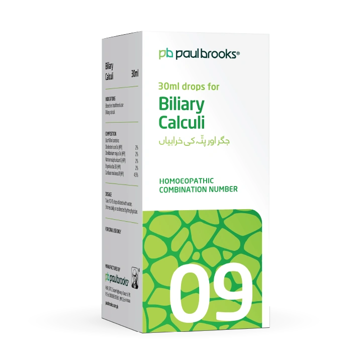Paul Brooks Combination No. 09 (30 ml) is a useful remedy for symptoms associated with gallstones and biliary discomfort. Enriched with natural ingredients like Cholesterinum, Chelidonium majus, and Carduus marianus, it helps manage biliary calculi and supports liver and gallbladder health naturally.