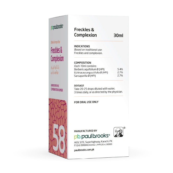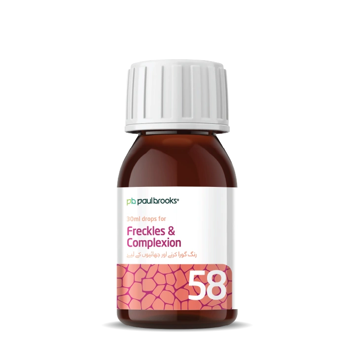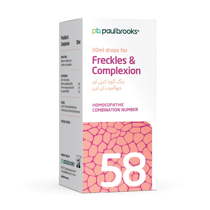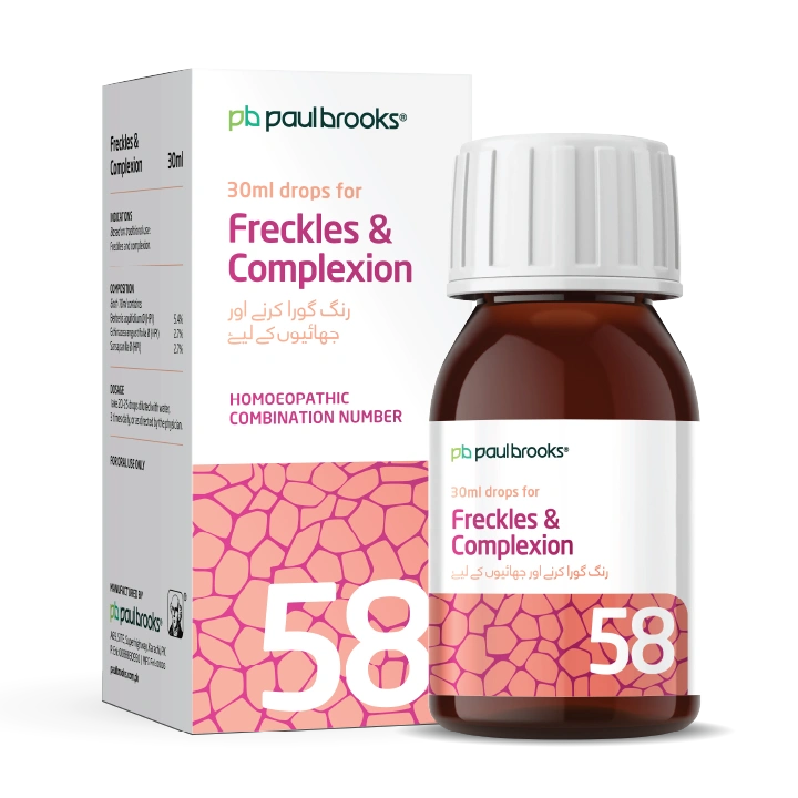 Paul Brooks Combination No. 58 (30 ml) is a valuable combination remedy for skin complexion. Enriched with natural ingredients like Berberis aquifolium, Echinacea angustifolia, and Sarsaparilla, it helps manage freckles and improve skin tone naturally.