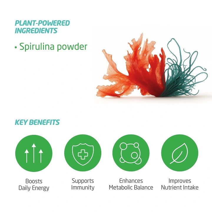 Spirulina Green Multis is a daily plant-powered multivitamin made with Blue and Red Spirulina. Packed with natural nutrients, it helps nourish your body from within, supporting immunity, metabolism, and everyday well-being the gentle, herbal way.