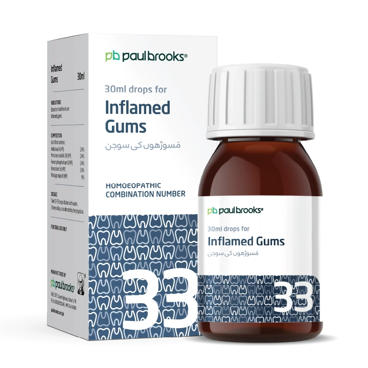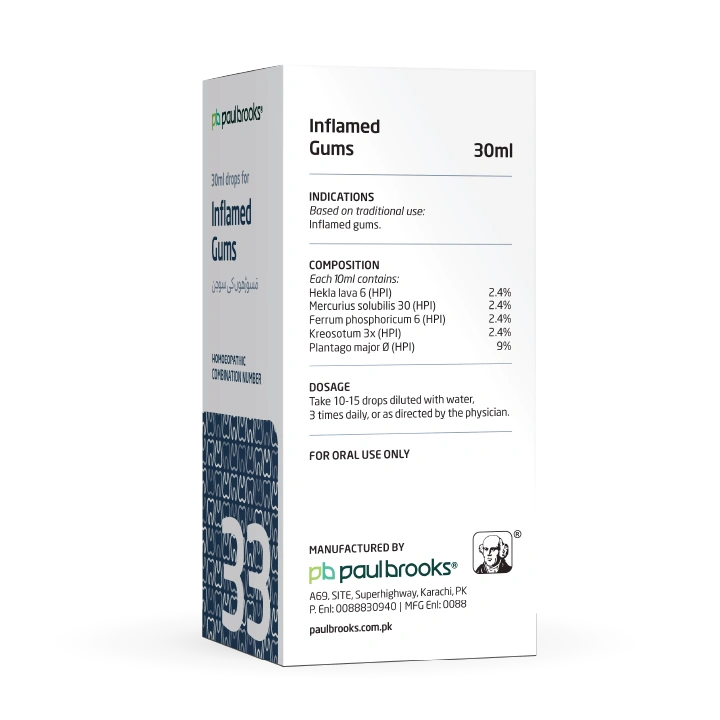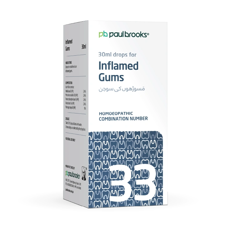 Paul Brooks Combination No. 33 (30 ml) is a useful remedy for symptoms associated with oral discomfort. Enriched with natural ingredients like Hekla lava, Mercurius solubilis, and Plantago major, it helps relieve inflamed gums naturally.