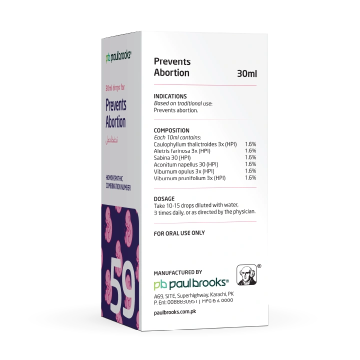 Paul Brooks Combination No. 59 (30 ml) is a specialized remedy traditionally used to support pregnancy and help prevent abortion. Enriched with natural ingredients like Caulophyllum, Sabina, and Viburnum, it works to provide uterine stability and support reproductive health naturally.