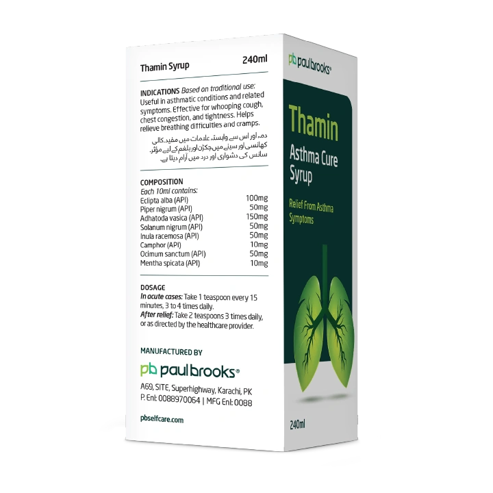Thamin Asthma Cure Syrup is a herbal remedy specifically formulated to provide relief from asthma symptoms and related respiratory distress. Enriched with traditional ingredients like Adhatoda vasica, Eclipta alba, and Ocimum sanctum, it effectively helps clear chest congestion, reduces tightness, and eases breathing difficulties.