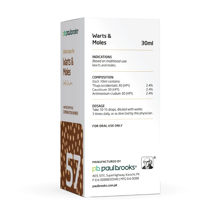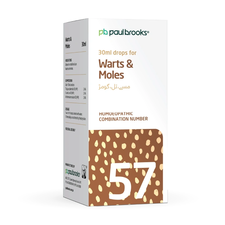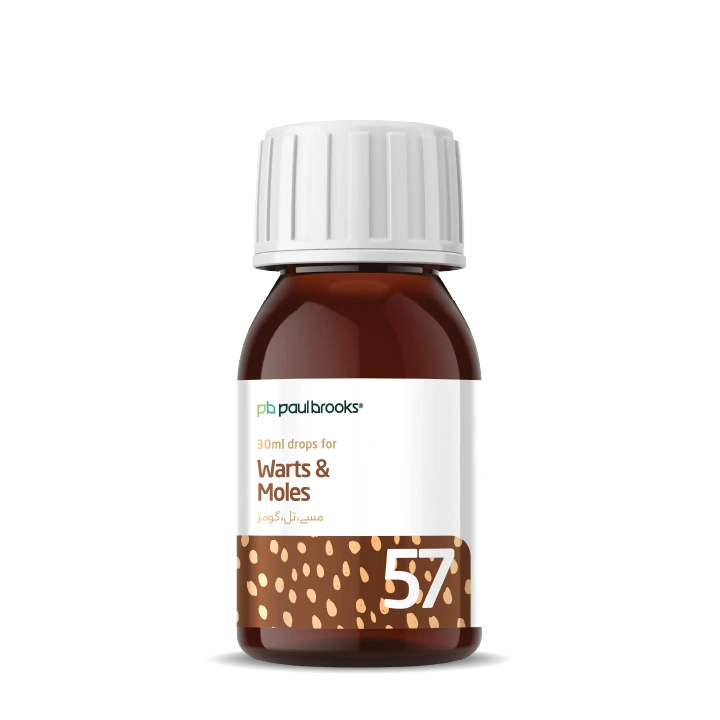 Paul Brooks Combination No. 57 (30 ml) is a well-balanced formulation for the treatment of warts and moles. Enriched with natural ingredients like Thuja occidentalis, Causticum, and Antimonium crudum, it helps address skin growths naturally.